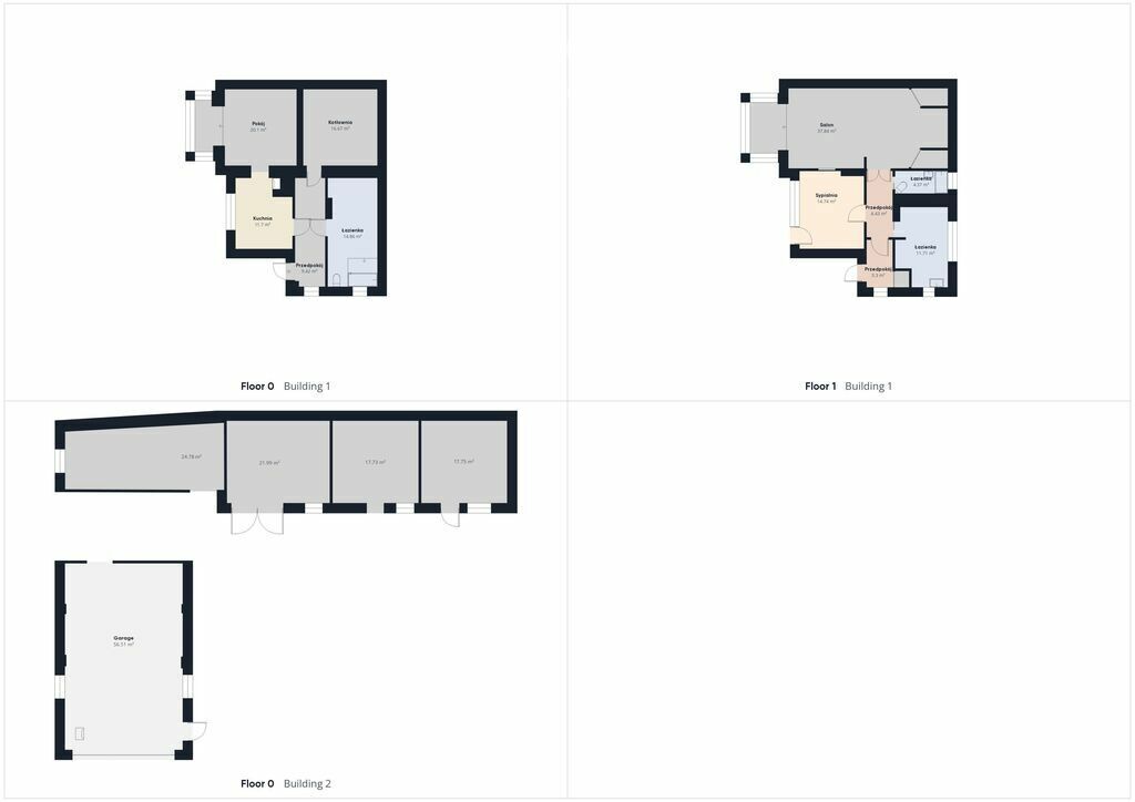 Parter: Kuchnia (11,7 m²), pokój (20,1 m²), bardzo duża łazienka