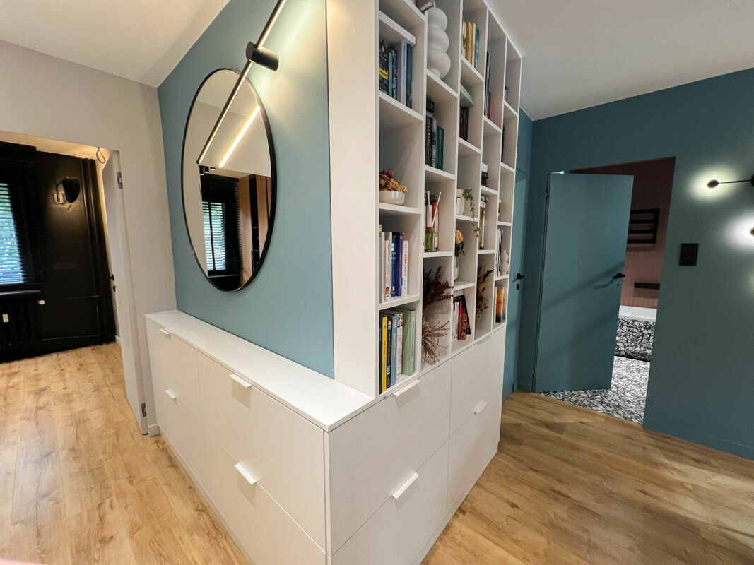 Wnętrze zostało kompleksowo umeblowane – meble wykonane wg indywidualnego projektu przez stolarza na wymiar – z pełnym wyposażeniem AGD w zabudowie (lodówka, piekarnik z funkcją mikrofali, pralko-suszarka). W oknach zamontowano rolety materiałowe / drewniane żaluzje oraz moskitiery. Mieszkanie z dużym balkonem, piwnicą i komórką lokatorską.