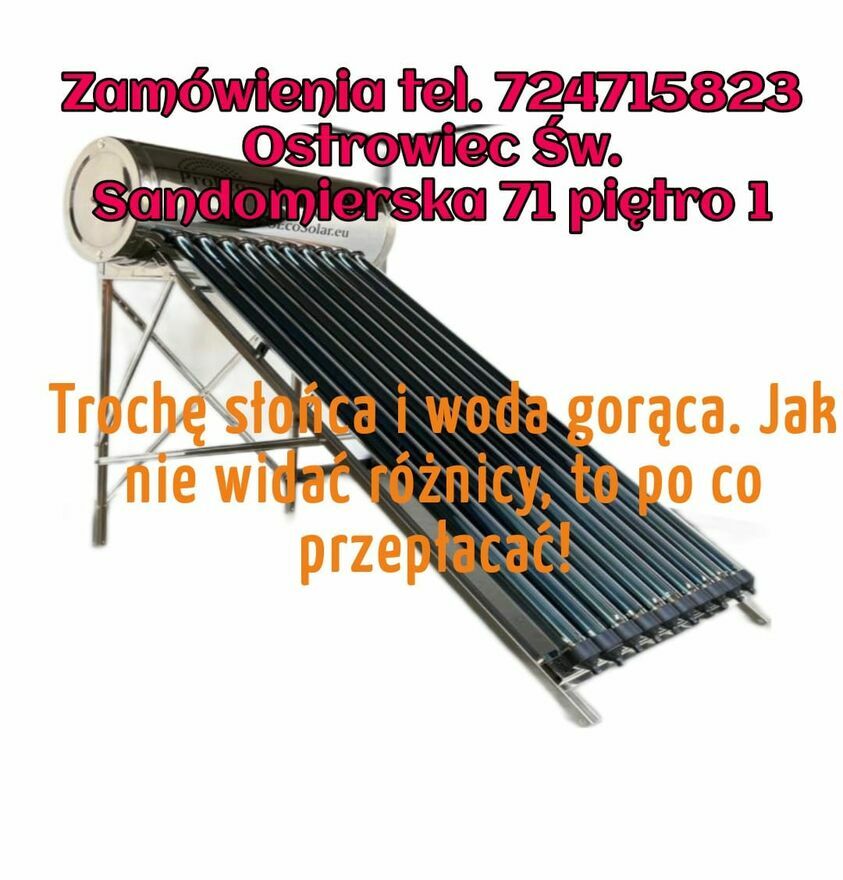 Słoneczny podgrzewacz wody, ok. 100 l. , dla 2-3 osób, nowy, nieużywany, w fabrycznym opakowaniu, nierdzewny , GWARANCJA, faktura. Nie czekaj, teraz taniej kupisz, uruchomisz wiosną.Darex, Ostrowiec Św., Sandomierska 71 tel. 724 - pokaż numer telefonu -