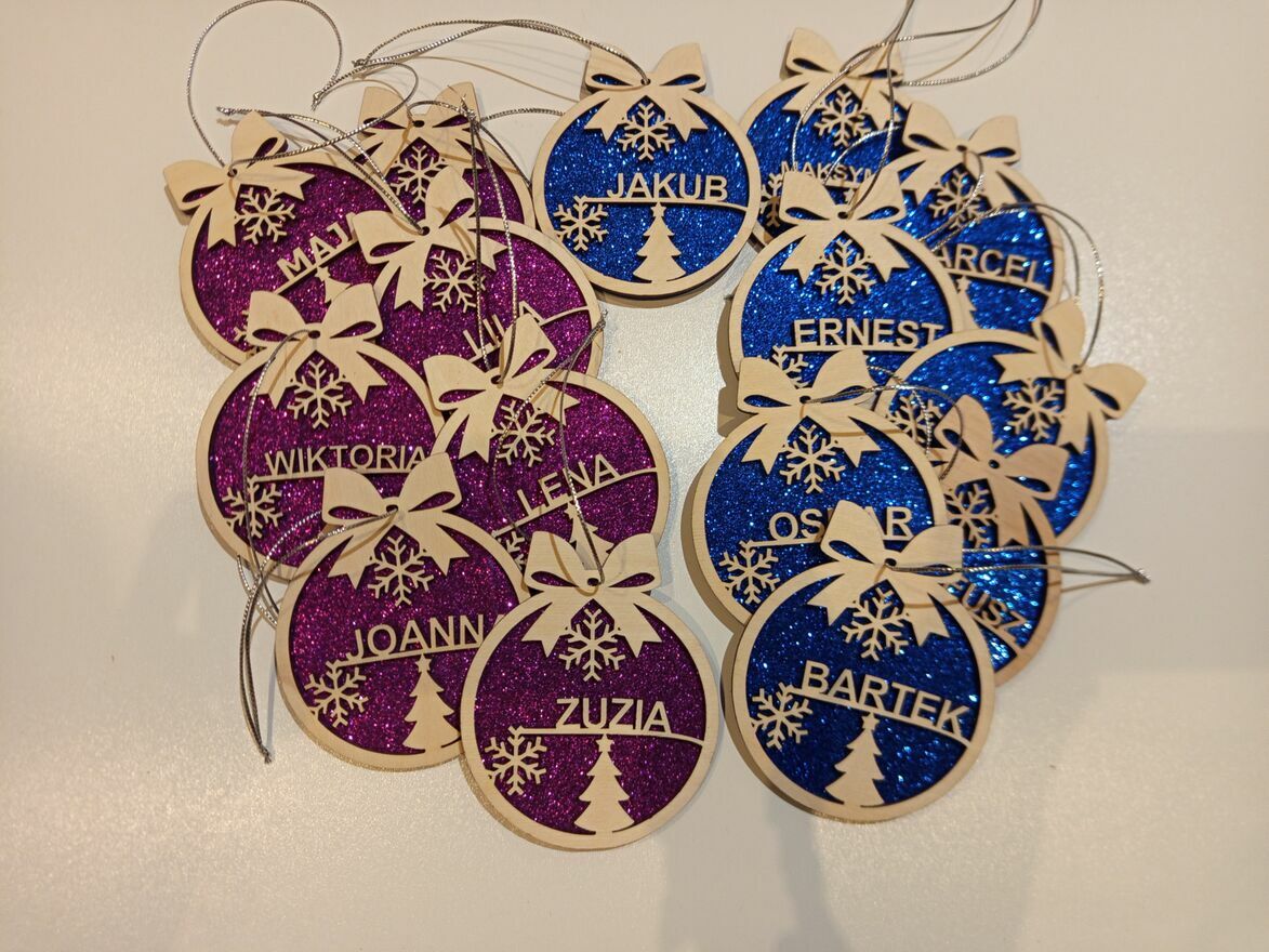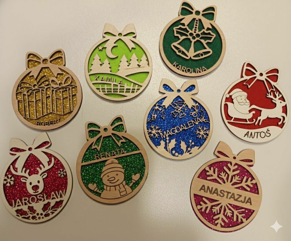 Personalizowane świąteczne zawieszki już dostępne!Każdą z nich wykonujemy ze sklejki lub białej płyty, a kolor tła wybierasz sam – brokatowe wersje prezentują się przepięknie!